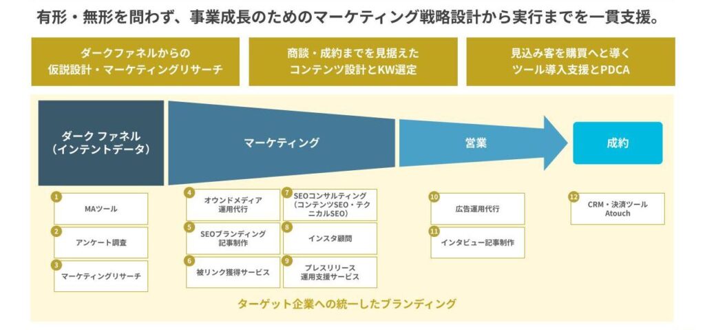 はちのす制作は、マーケティング活動における潜在顧客へのアプローチから、顕在顧客の刈り取りまでを一気通貫して行っています。また、自社サイトに訪問した見込み顧客をいち早く特定し、商談化数を最大化させます。